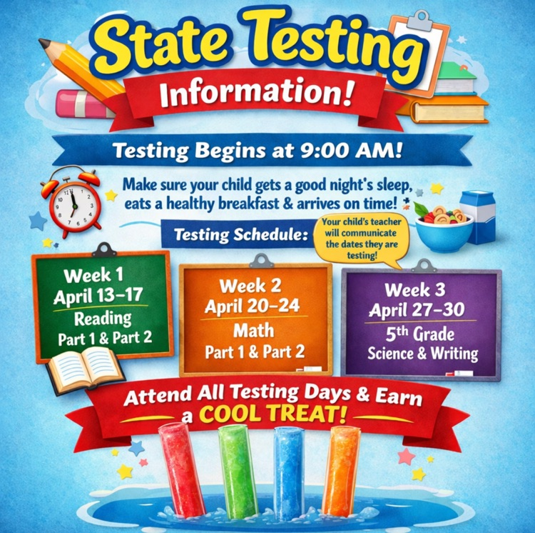State testing is coming up! Please note the important testing dates and plan accordingly. We kindly ask that you schedule any appointments outside of these dates to ensure your child is present and able to do their best!