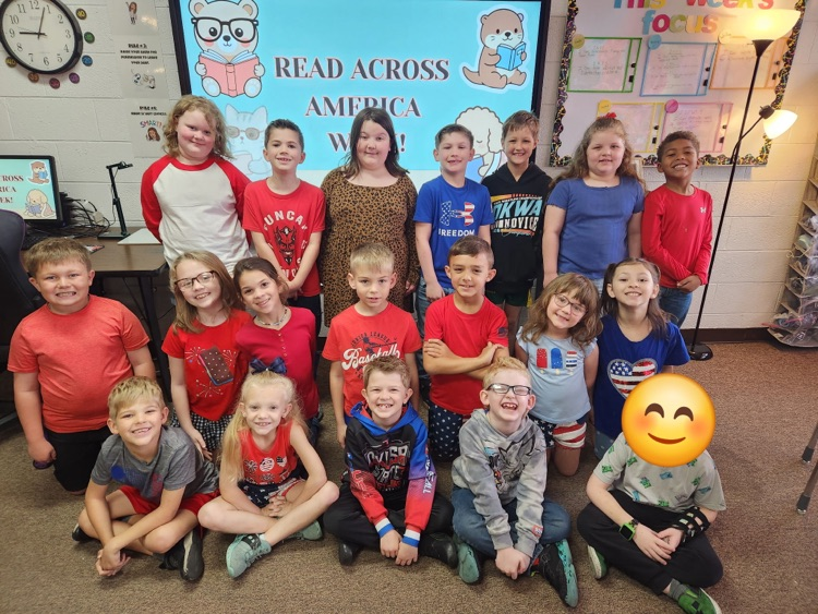 Mrs. Smiley's class is wearing their Red, White and Blue to show unity as we read across America!