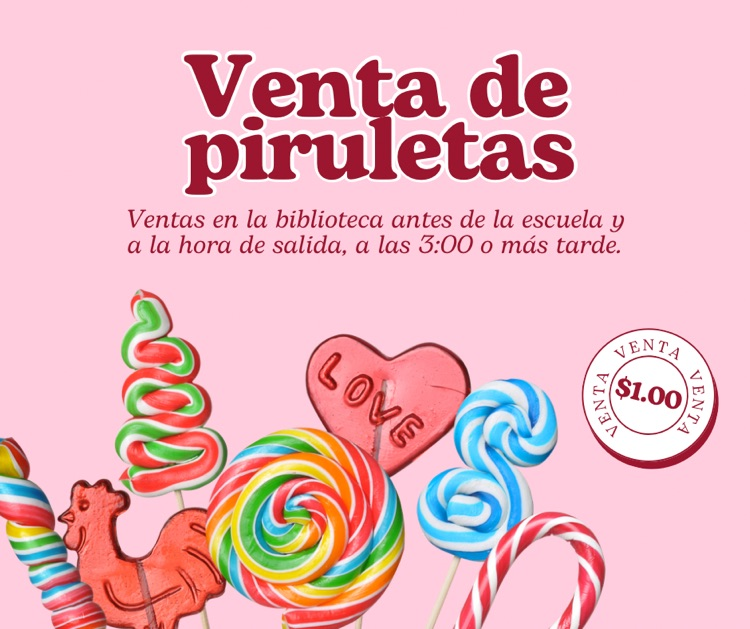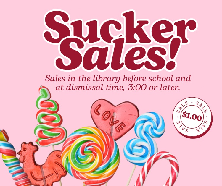 Just a reminder that students can buy suckers in the library before school or during dismissal for $1.00. 🍭